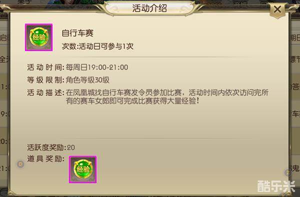 每周日19:00到21:00,开启“自行车赛”任务;角色等级达到30级后可在活动日参与1次。活动时间内依次访问完所有的赛车女郎即可完成比赛获得20点活跃度奖励以及丰厚的经验奖励。前50名完成的玩家还可以获得额外奖励哦~!