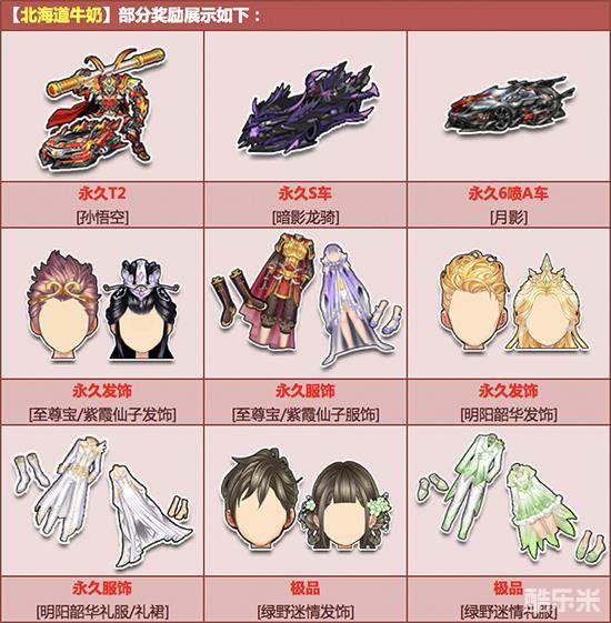 10月11日-11月20日,购买角色经验卡+900,赠送【北海道牛奶】,有机会得永久T2【孙悟空】、永久S车【暗影龙骑】、永久6喷A车【月影】、永久【至尊宝发饰/紫霞仙子发饰/服饰】/【明阳韶华发饰/礼裙/礼服】或其他奖励之一!其中核心极品期限型概率范围为:4%-6%,核心奖励永久型概率范围为:2%-4%,非核心奖励概率范围为:90%-94%。