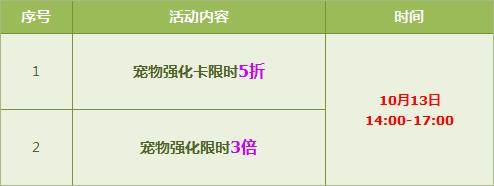 10月13日14:00-17:00期间,宠物强化特别活动开启,宠物强化卡限时5折,宠物强化限时3倍,赶紧来参与!