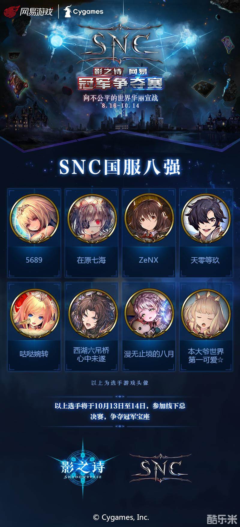 剑拔弩张,大神云集,巅峰时刻即将来袭!随着赛事进程一步步推进,在众多玩家的共同努力下,由网易主办的《影之诗》网易冠军争夺赛(Shadowverse NetEase Championship,以下简称SNC)终于即将迎来最后的决战时刻!10月13日,14日,SNC大赛线下总决赛即将强势来袭,8强同台,最终谁将登上冠军宝座?一同期待奇迹来临的时刻吧!