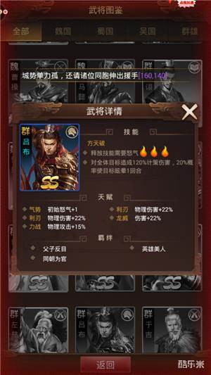 吕布,群雄将领。技能时方天破,释放需要3个怒气。其效果是对全体目标造成120%计策伤害,20%概率使目标晕眩1回合。技能伤害足够又带控制,气势为初始怒气+1;利刃一为物理伤害+22%,利刃二为物理伤害+22%;双重破甲。龙威是伤害+22%;力战是物理攻击+15%。可以说相当暴躁的老哥。大招还有一定几率晕眩。配合上其羁绊父子反目、英雄美人、同朝为官。吕布可以成为您豪夺天下的大将。