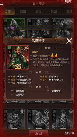 关羽,蜀国大将。技能春秋斩,释放需要2个怒气。其效果是对敌方后排造成120%的物理伤害并附加一层流血,每回合受到40%的伤害持续2回合,可与其他流血效果叠加。天赋为龙威伤害+22%;闪避+30%;利刃物理伤害+22%;霸体伤害减免+22%;力战物理攻击+15%。羁绊为忠肝义胆、先锋猛将、桃园结义。高伤buff型的后排刺客(?),对于有很多靠后排发力的阵容非常克制。