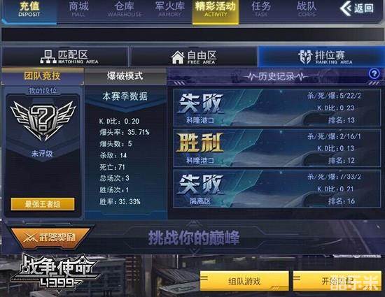 登录《4399战争使命》,点击右方的排位赛,即可进入排位赛界面。排位赛有两种模式,分别为团队竞技和爆破模式