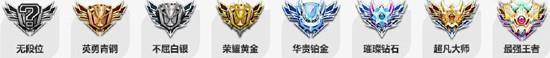 1、段位等级依次排序:英勇青铜,不屈白银,荣耀黄金,华贵铂金,璀璨钻石,超凡大师,最强王者。