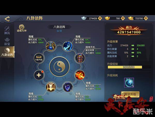 八卦法阵共有八个阵眼,布阵者需用诸葛锦囊提升阵法等级,开启阵眼。法阵中每个阵眼皆有不同效果,只有使用对应神器才可激活。如乾阵灵、坎阵灵,可将位于阵眼上神器的属性扩大数倍,使玩家获得大幅战力提升;而震阵灵、艮阵灵则可增强神器自身技能,使之发挥更大威力。如神兵“霸碎”的破甲效果,通过法阵提升后触发几率提高、冷却时间降低、破甲效果同时得到强化。