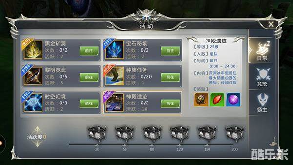玩法类型:日常解锁条件:25级玩法人数:单人、组队开放时间:全天玩法入口:活动界面,神殿遗迹入口每日次数:2玩法产出:装备、强化石