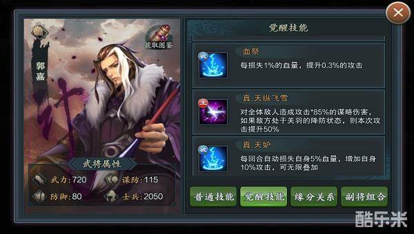 当然被评为“才策谋略,世之奇士”当然不只这点实力。在觉醒之后自己原本的几个技能会有质的飞跃,同时血祭在每损失1%的血量的时候会提升0.3%的伤害。