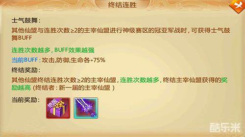 当然,为了提高游戏的竞技性,为了避免出现一家独大的垄断局面,如果一个仙盟连胜次数过多,那么在神级赛区决赛时,对与其进行决赛的队伍会有BUFF加成的,且主宰神殿仙盟连胜次数越多,BUFF效果越强。而且终结连胜的奖励同样包括绝世神兵“嗜血戮仙”!
