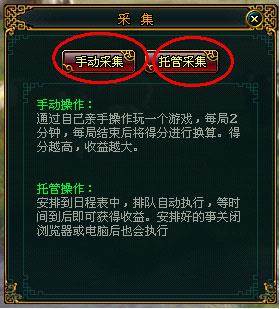 采集原料:到世界地图上找到相应的原料点(本职业可采集的原料),点击后出现手动采集和托管采集两个选择。如下图: