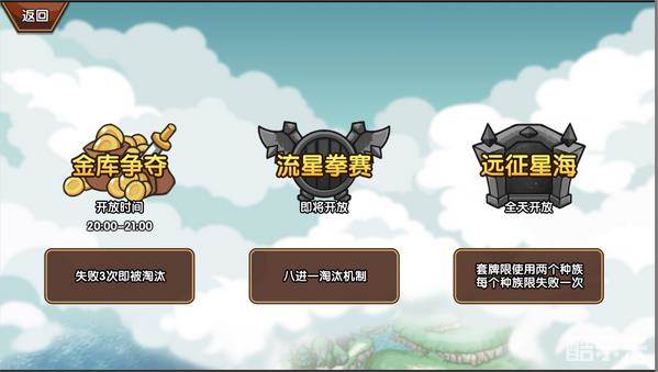 类似炉石的竞技场,每个玩家使用一套自己的卡组,可以更换卡组,参与到金库争夺的对战。你只有3次失败的机会,并且只能在这1个小时之内,胜场数越多得到的奖励越多。1/3/5/7/9/后面不太清楚,都会有不少的金币奖励,12胜时更是能够直接获得史诗卡牌!