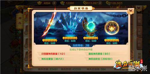 虽然神耀本身不带来属性上的提升,但兵魂技能的升级需要神耀达到固定的等级,才可进一步使用神兵精魄和铜钱进行升级。神兵精魄可以通过宗门禁地和每日限购获取,而神耀等级提升涉及面较多。神耀由四个固定神兵组成,神耀等级在满足觉醒神兵数量、最低神兵星级、神兵总星级、神兵总阶位四个相应条件后可自动提升,无需操作,也不需要任何消耗。