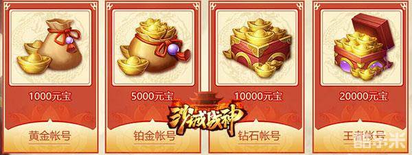 任意新老平台用户均可在活动页面进行账号鉴定,根据账号注册时间、所玩游戏数量、充值等综合要素评定账号级别:黄金、铂金、钻石、王者……玩家可凭账号级别获取相应数量的元宝,《沙城战神》公测后元宝将发放至账号创建的第一个游戏角色的邮箱中。