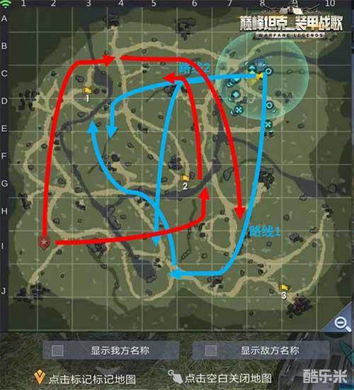 1眼位:眼位在攻防中都非常重要,通常由侦察装甲车以及坦克掌控。由于眼位距离比较靠前,所以需要机动较快的装甲车来点亮,但是有个别眼位如G7的眼位位置比较突兀,会和敌方的眼位互相点亮,很大几率会遭受攻击,因此这种眼位可以使用防护性更好的坦克来控制视野。
