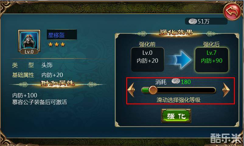 所有装备均可以通过游戏内产出的银两进行强化,强化100%成功。并可通过移动滑块,选择需要强化的等级: