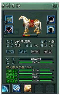 提升坐骑潜力---如你的坐骑攻击潜力是显示500/1000,说明此坐骑的攻击可提升到最大1000满攻击数值。