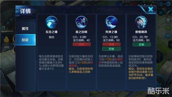 三技能“傲慢嘲讽”,白起嘲讽范围内的敌军持续2秒,期间自身受到的伤害将被降低20%/25%/30%;被动:受到攻击每层会提升移动速度10点与护甲30/60/90点,最多叠加3层持续3秒。三技能可对敌人打出范围嘲讽的效果,在团战中这一技能极为实用,可让敌人无法及时释放技能,为友军争取了充足的输出时机,让胜利的天平逐渐向我方倾斜;这一技能还可在队友被追击时释放,巧妙地限制敌人的追击,为友军争取逃生的机会。