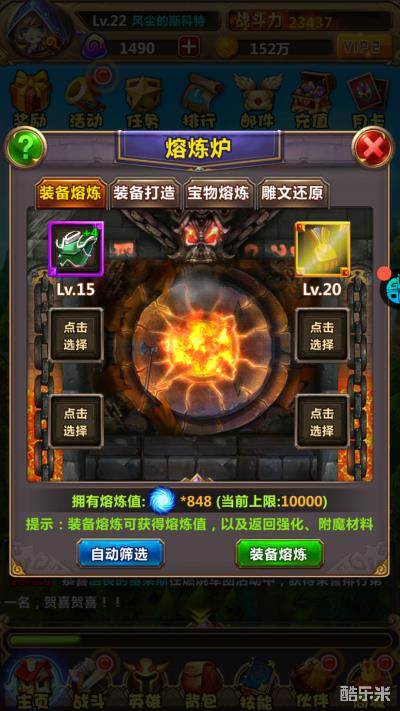 熔炼值可以用来打造装备,可以打造出比同等级、同品质属性更高的装备,最低也是紫装。终于,不用充钱也能搞到好装备了……要注意的是,打造出来的装备等级是和玩家当前的挂机副本等级相关的。所以,骚年,先去把副本推平了吧!