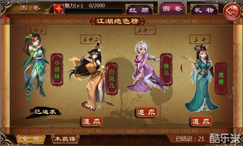 点开红颜-图卷之后,可以看到已经结识的红颜,魅力达到要求即可选择追求。每次通关剧情之后,都有一定几率结识不同的红颜。