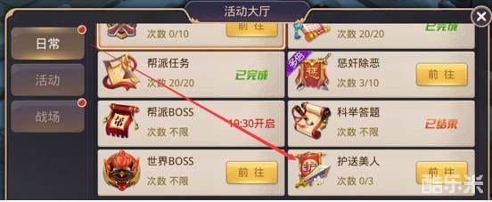 等级≥43开启护送美人,通过主界面“活动”图标进入。