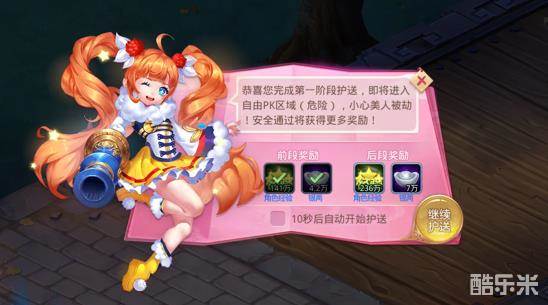 3、共有两段护送,第二阶段护送会进入自由PK区域,被击杀会被劫镖,第二段奖励被扣除一部分。