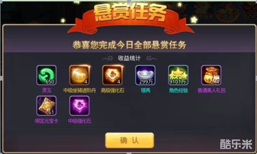 2)悬赏任务:角色等级≥42,开启悬赏任务,主界面任务栏可点击开始。每天可完成20个悬赏任务,奖励海量经验和珍稀道具。
