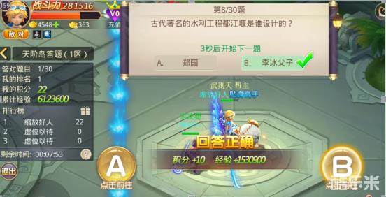 3)答题活动:角色等级≥50,开启科举答题,通过主界面“活动”入口进入。进入正确答题区时间越快,获得积分越多,活动结束后根据积分排名发放奖励,第一名可获得“状元”称号!