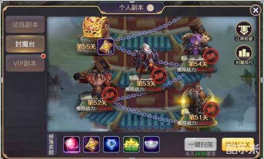 4)封魔台:角色等级≥56开启试炼副本,通过主界面“个人副本”进入。封魔台每天可无限次挑战未通过的副本关卡。虽然不多,一分经验也是爱!