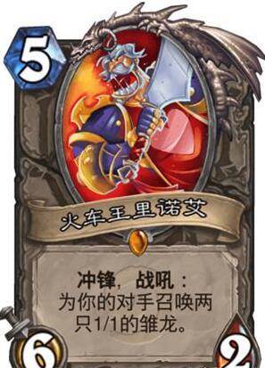 火车王算是我们的老朋友了,这位原画画风有点夸张但又不失风度和气度的能冲锋的随从,曾给我们太多胜利的喜悦!我之所以热切希望它早点削弱是因为它用1600尘合的(认真脸),如果它滚回荣誉室我就可以合成一些紫卡来玩各种娱乐套装。当然,如果它真的退休了,就意味着整个环境都没有什么特别强的中立冲锋卡了!