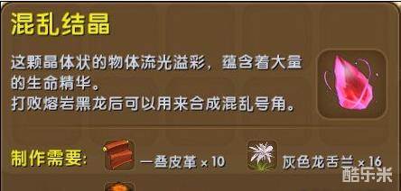 混乱结晶:这颗晶体状的物体流光溢彩,蕴含着大量的生命精华。打败熔岩黑龙后可以用来合成混乱号角。