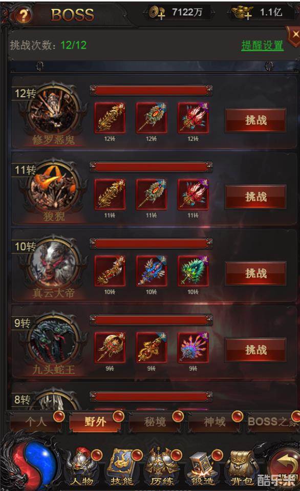 a. 玩家在个人BOSS中可以独占强大的BOSS收益,该BOSS掉落与野外BOSS掉落一致