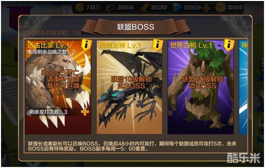 联盟boss是有不同等级的,boss 的等级越高,玩家有几率获得稀有的道具奖励。不同等级boss的属性也不一致,可以点击小感叹号查看Tips哟~