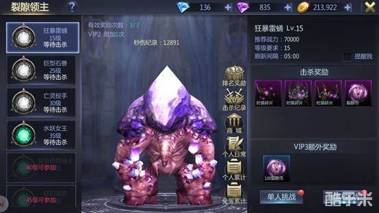 全天开启,每日三次,玩家可以单人或组队进行战斗,将BOSS击杀后会根据排名给玩家发当奖励。击杀后还会获得裂隙币,伤害排名越靠前则奖励越多。