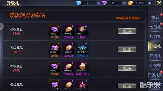 提升等级赢好礼,我们会在玩家升级的每一个等级阶段,送出对玩家在此阶段非常有用的道具及奖励,助力玩家更快提升战力。其中奖励主要为粉钻、金币还有各类稀有材料。