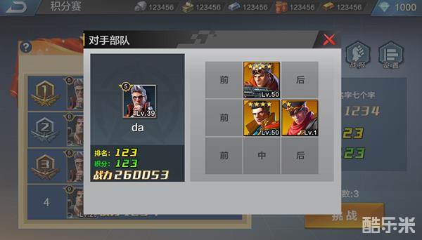积分赛每周开启时间为每周一0点到周日21点,对抗采取1V1的战斗模式,与竞技场一致,使用系统士兵,无损兵。指挥官可以通过玩法界面上挑选合适的对手进行战斗。挑战前可以通过查看对手的基础信息和阵营情况,进行战前布阵
