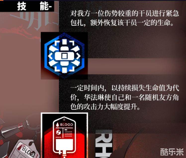 第二技能“不稳定血浆”触发时会以持续损失生命值为代价,大幅度提高自己和攻击范围内一名干员的攻击力。