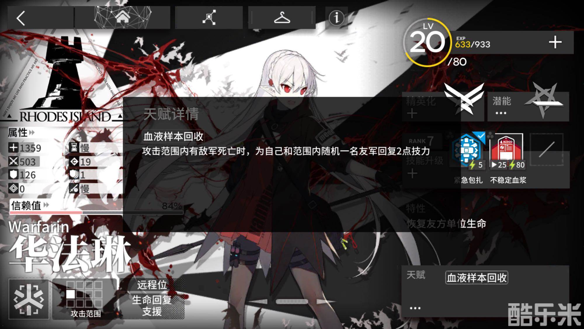 华法琳的个人天赋为“血液样本回收”,非精英化时攻击范围内有敌军死亡时会让自己和攻击范围内某一干员提升1点技力。