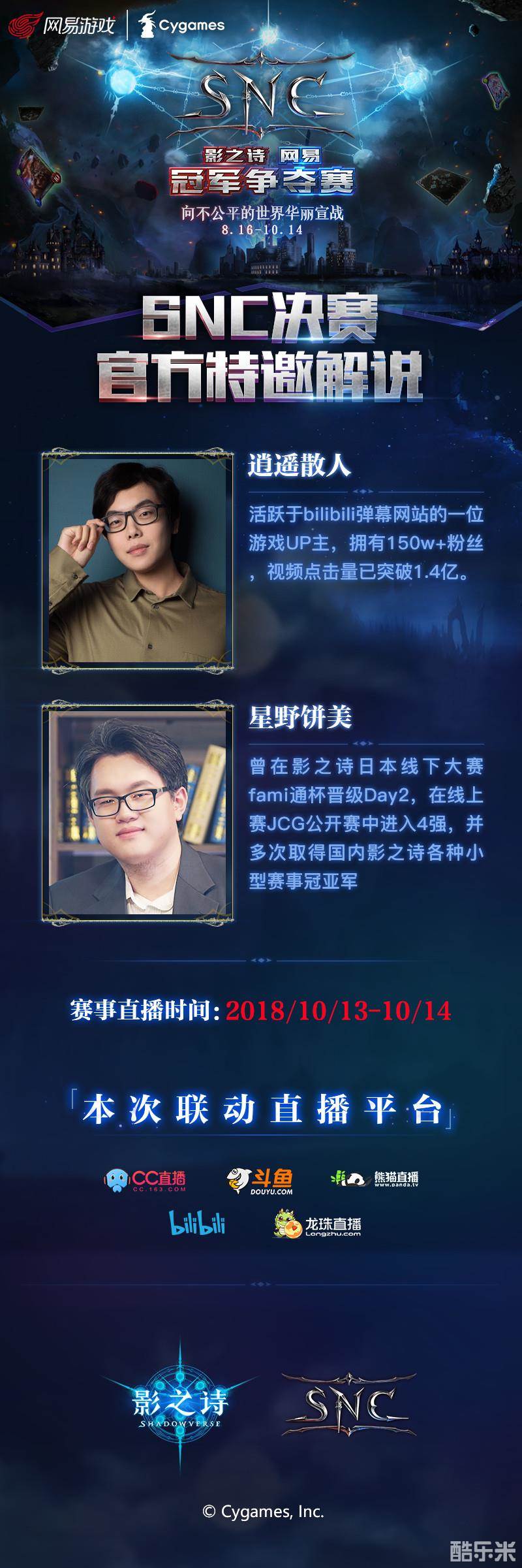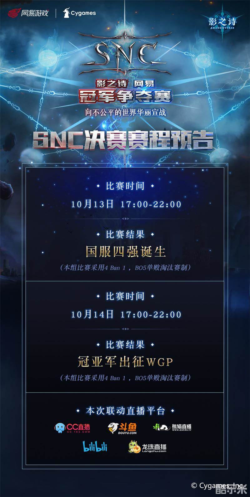 SNC巅峰决赛将在10月13日-14日展开,观众可以通过CC直播、斗鱼直播、熊猫直播、哔哩哔哩直播、龙珠直播平台进行线上观看比赛,共同见证SNC国服冠军的诞生!