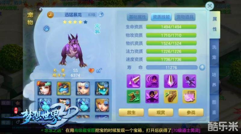 这只变异迅猛暴龙在没有穿戴饰物的情况下就能满物攻资质和速度资质,真是速攻打法的好苗子。双技能护符中的敏捷提升本来就高的速度,配合高级迅雷,对速度比其低的召唤兽提升伤害,更进一步加强其速度的优势。值得注意的是领悟的天赋里没有追星赶月,但领悟了一个萌化攻击,这和他的形象形成了强烈的反差萌,有多反差,少侠们去游戏内打造一只便知啦。