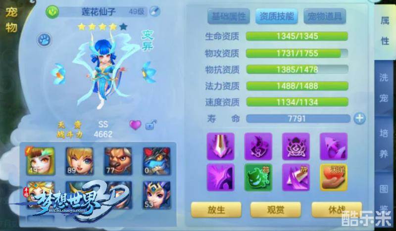 这只变异物理莲花仙满物攻资质,由于带有隐身技能的护符,伤害会受到一定影响。除了标配的高必杀高连击外还有高级溅射、高驱神和高迟钝,也就是说她经常会在战斗的最后收割场上残血并直接将那些妄图用神佑复活的宝宝打出场外。对于这样莲花杀手,少侠们只需带上没有神佑、冲击但有幸运、反震、敏捷、感知等技能的宝宝就可与冷艳杀手一较高下了。