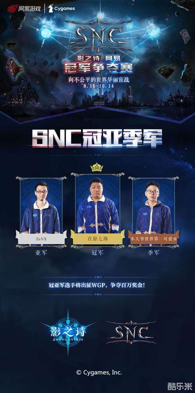 向不公平的世界华丽宣战!”《影之诗》网易冠军争夺赛(Shadowverse NetEase Championship,简称SNC)现已华丽落幕。10月13日-14日,通过海选杀出的八名选手齐聚上海,展开了最终的巅峰之战。最终,在原七海选手一路过关斩将,捧得冠军和8万奖金;ZeNX收获亚军,本大爷世界第一可爱名列季军。在原七海和ZeNX也获得了通往《影之诗》World Grand Prix赛事(简称WGP)的两个名额,他们将代表中国大陆赛区向全世界的强者发起挑战!