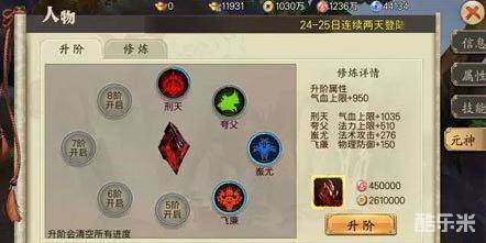 修炼元神需要消耗铜钱和真气;每一阶段十二个孔,修炼满后就需要进阶来开启下一阶段。进阶需要消耗一定数量的赤魂石碎片、铜钱和真气。
