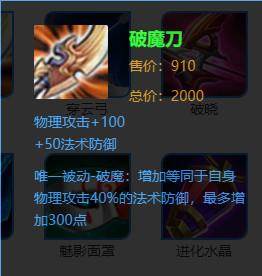 后期的输出英雄要么出复活名刀,要么干脆买正八经的防御装备,出了破魔刀那点攻击加成有限,防御可以,很多英雄对血量的需求还是比防御要大的,哪怕增加500的生命值选取率也会高了很多。