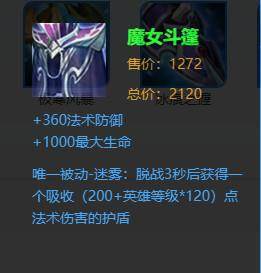 同样是增加法防的装,魔女的价格比破魔刀贵了120,这点经济后期基本可以忽略,但是1000的生命值是无法替代的,很多人不考虑破魔刀的原因就是没有生命值的加成,况且魔女的被动还有一个法术护盾,非常适合打消耗战。
