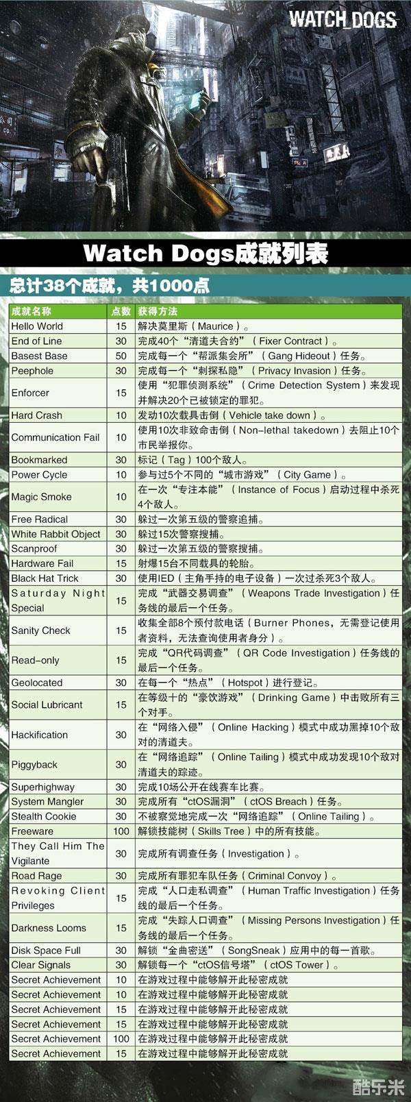 在看门狗中总共有38个成就可以达成,而成就点数总共有1000点,如果想要全部达成的完成那就要好好看看咯,希望大家都能够顺利的完成哦。(注:可点击看大图)