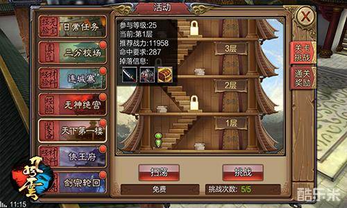 打开活动,点击天下第一楼,系统会提示你参与等级必须在25级以上,推荐战力和命中要求以及掉落物品的信息,先告知玩家们一件事,挑战的时候建议换一把好一点的武器,比如一元硬币兑换的橙色武器,不但可以加成VIP属性,还能提高你的战力。