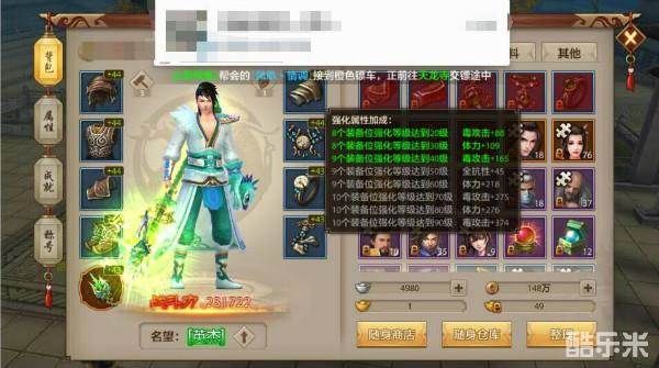 二:装备强化等级。银两商城,帮会商店,充值礼包中都可以获得大量的地煞强化精华,游戏前期可以增加很多的属性和战斗力,全身强化等级达到指定要求也会有额外的属性加成。