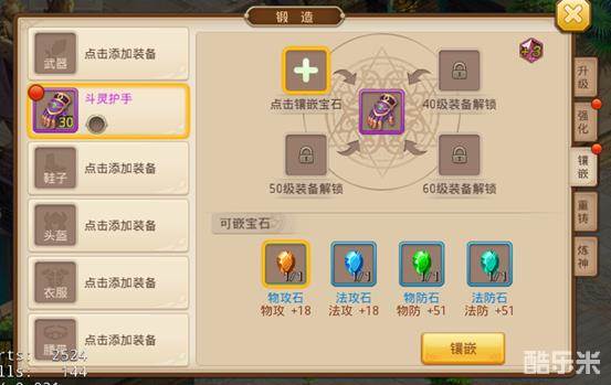 魂导装备升级到30级以后,可以在装备上镶嵌宝石,玩家可以根据自己的魂师职业来决定在装备上镶嵌物攻石、法攻石、气血石、物防石、法防石、速度石、暴击石、抗暴石,一件装备上最多镶嵌四颗不同类型的宝石。