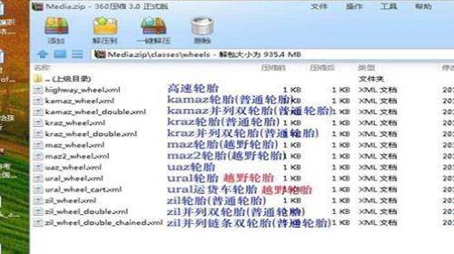 1.车辆的轮胎数据文件在Media.zip里,点击进入wheels文件,能看到许多轮胎xml文件,具体名称已注明(如下图所示):