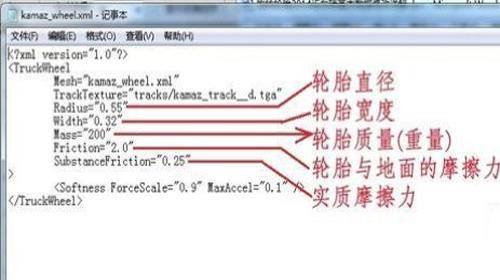 2.最后一个zil_wheel_double_chained.xml指带防滑链条的双轮胎,不过在游戏中其越野性能提升很小。例如,用记事本打开kamaz_wheel.xml文件,具体描述如下图所示: