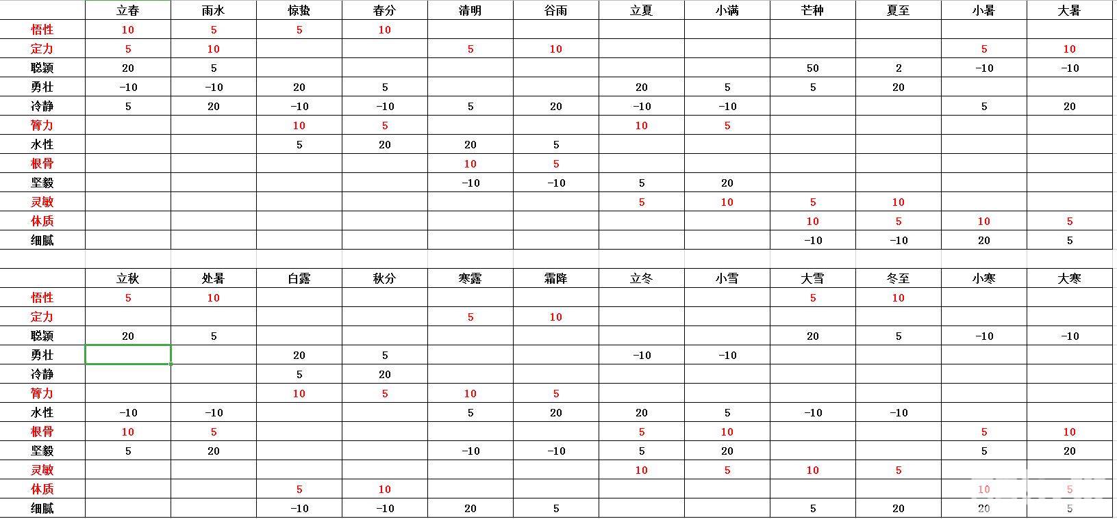 而芒种、夏至两节气,副属性分布明显错误,应该是个BUG,芒种副属性合计45点,为24节气之首,夏至合计12,副属性最低。